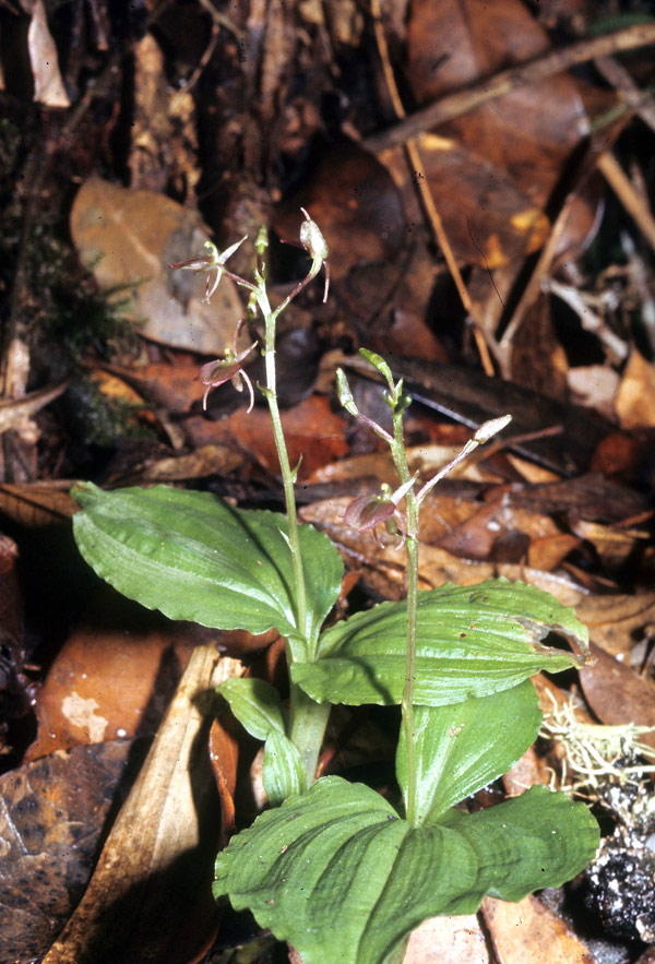 Found in southern India, Sri Lanka, Java and Sumatra in submontane forests and tropical wet evergreen forests at elevations of 900 to 1800 meters as a miniature sized, warm to cool growing terrestrial with close set, ovoid pseudobulbs enveloped partially by a few smaller sheaths and carrying 2, ovate, acuminate, plicate, finely undulate margins, gradually narrowing below into the petiolate base leaves that blooms in the winter on a 4" [10 cm] long, 10 to 16 flowered inflorescence with narrowly triangular, acute floral bracts.