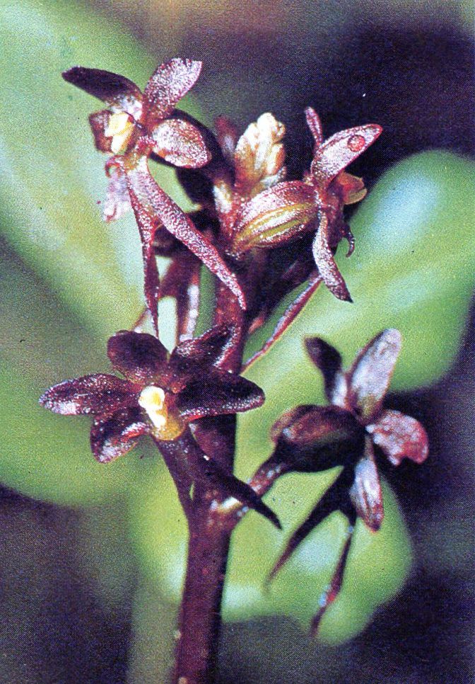 Synonyms Bifolium cordatum (L.) Nieuwl. 1913; Cymbidium cordatum (L.) Londes 1811; Diphryllum cordatum [L.] Kuntze 1891; Distomaea cordata (L.) Spenn. 1825; Epipactis cordata (L.) All. 1785; Helleborine cordata (L.) F.W.Schmidt 1793; Listera cordata (L.) R. Br. 1813; Listera cordata f. rubescens P.M.Br. 1995; Listera cordata f. tetraphylla Lavoie 1984; Listera cordata f. trifolia P.M.Br. 1995; Listera cordata f. trifolia (Asch. & Graebn.) Pauca & Stefur. 1972; Listera cordata lus. trifolia Asch. & Graebn. 1907; Listera cordata f. variegata P.M.Br. 1995; Listera cordata f. viridens P.M.Br. 1995; Listera cordata var. chlorantha Beauverd 1926; Listera cordata var. nephrophylla (Rydb.) Hultén 1937; Listera nephrophylla Rydb. 1900; Neottia nephrophylla (Rydb.) Szlach. 1995; *Ophrys cordata L. 1753; Ophrys nephrophylla (Rydb.) Rydb. 1905; Pollinirhiza cordata (L.) Dulac 1867; Serapias cordata (L.) Steud. 1821