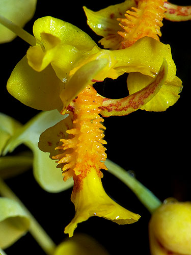 Found in Nicaragua, Costa Rica and Panama at elevations of 300 to 1800 meters as a medium sized, hot to cool growing epiphyte in lower montane forests on large trees and branches with cork-like bark with laterally compressed, elongate stems enveloped completely by imbricating, distichous, basally clasping, closely spaced, alternate, obliquely angled, fleshy, triangular, acute, entirely conduplicate longitudinally leaves that blooms late winter and spring on an axillary, to 1.2" [to 3 cm] long, paniculate, few to many flowered inflorescence with a few branches carrying one to a few flowers.
