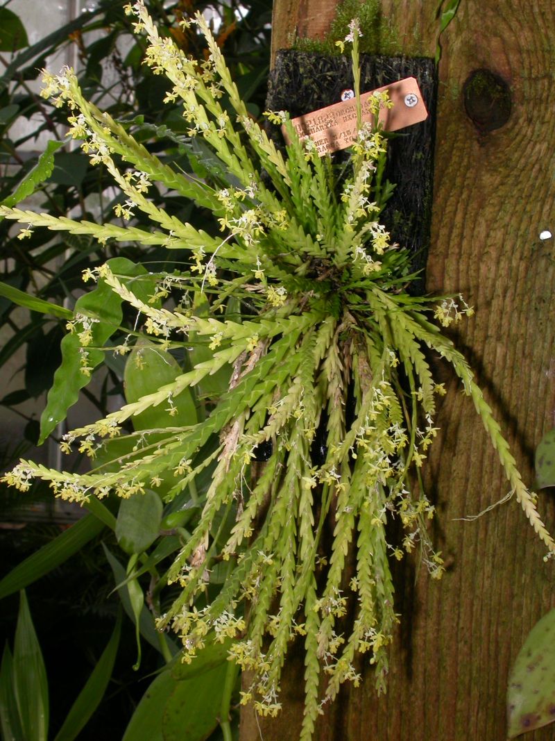 Found from Nicaragua, Costa Rica, Panama and Colombia in rain forests as a medium sized, hot to warm growing epiphyte at elevations of 10 to 1000 meters with a pendulous stem, completely enveloped by many distichous, imbricating, basally clasping, triangular, entirely conduplicate leaves and blooming on a unbranched, 1 to 2 flowered, 3/4" [2 cm] long inflorescence held close to the apex of the leaves with small flowers that do not open fully occuring in the winter and spring.