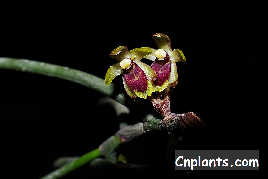 Found in Zhejiang, Fujian and western Hubei provinces of China on rocks and on cliffs along valleys or on tree trunks in sparse woods at elevations of 200 to 1300 meters as a small sized, warm to cool growing lithophyte or epiphyte with tufted, suberect, rigid, terete stems carrying several to many, terete, fleshy, 2 to 3.6" [4 to 9 cm] long, amplexicaul and clsping base leaves that blooms in the spring on an, opposite of the leaves, .4 to .6" [1 to 1.5 cm] long, racemose, usually 2 to 3 flowered and carrying flashy flowers