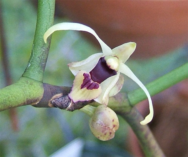 Found in Bangladesh, eastern Himalayas, India, Thailand, Laos, Vietnam and Yunnan province of China in dense forests on tree trunks at elevations of 100 to 600 meters as a small sized, hot to warm growing epiphyte with an often arching stem carrying at intervals towards the apex, terete, acute leaves that blooms in the spring, halfway between the internodes on a 1/2" [1.25 cm] long, successively single flowered inflorescence with obliquely imbricating, truncate, dark brown bracts