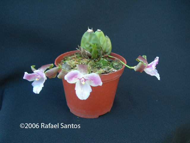 Found in Costa Rica, Nicaragua and Panama as a medium sized, cool to warm growing epiphyte with spined psuedobulbs in wet montane forests at elevations of 800 to 1800 meters with ovoid, tapering pseudobulbs with long spines after leaf fall carrying 3, ribbed, plicate, elliptic leaves that blooms in the later spring with scented [apples] flowers on an erect, several at once, to 3" [7.5 cm] long, single flowered inflorescence with several tubular sheathing bracts and arising the most often with new growths.