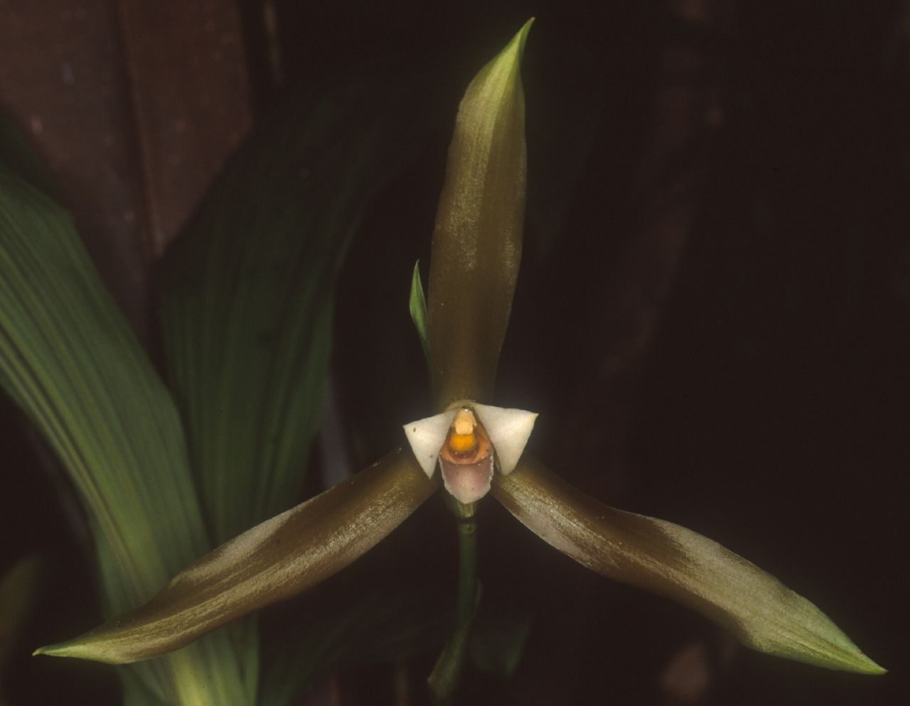 Found in Risaralda and Valle de Cauca departments of Colombia at elevations of 1250 to 1800 meters as a large sized, warm to cool growing lithophyte or terrestrial orchid with large, broadly cylindrical or oblong-ovoid, compressed, sulcate or rugose with age pseudobulbs carrying 2 to 3 apical, plicate, deciduous, long petiolate, oblong-elliptic or oblong-lanceolate, acute or acuminate leaves that bloom in the spring and summer although it can be variable on a basal, erect, usually few at once, to 12" [30 cm] long, single flowered inflorescence arising on a mature pseudobulb and subtended by a few, large, loose, tubular sheathing bracts and with the nodding, waxy, fragrant flowers held among the leaves.