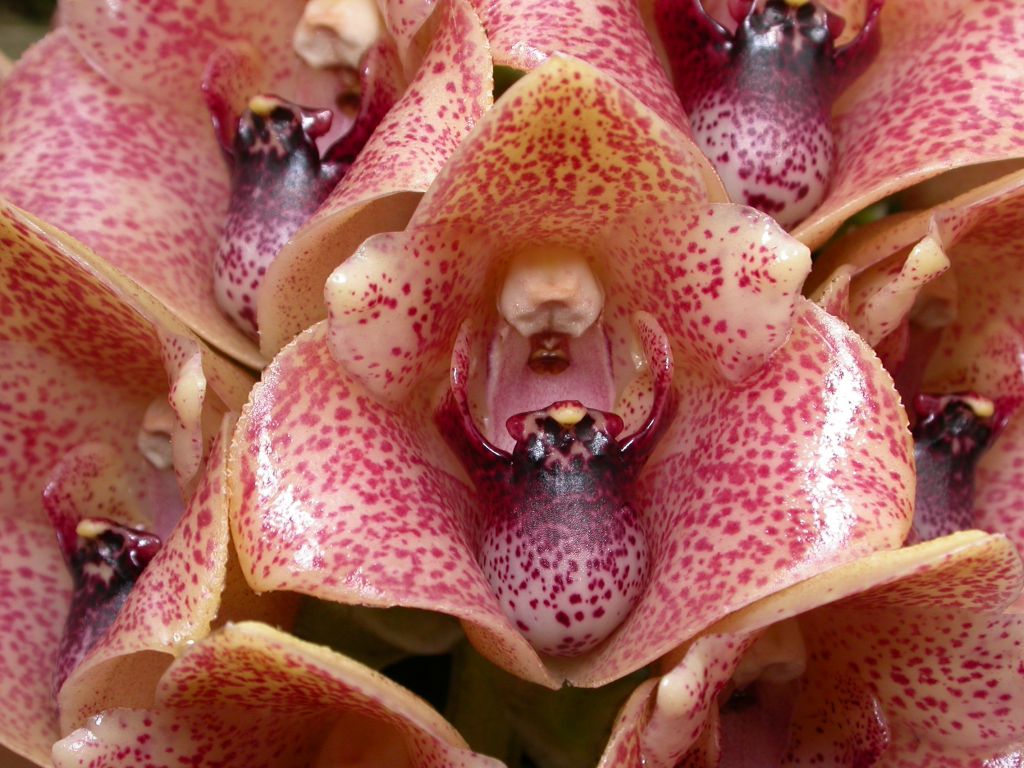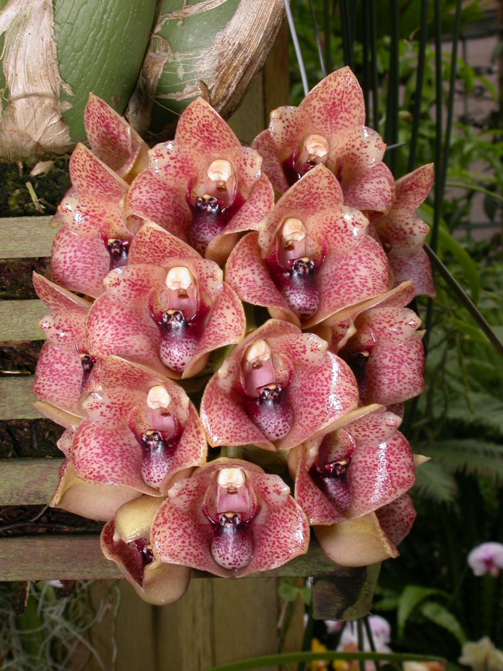 Found in Ecuador and Peru on steep embankments in wet montane forests at elevations of 900 to 1500 meters as a large sized, warm to cool growing terrestrial or epiphyte with ovoid-pyriform, compressed, ancipitous above pseudobulbs carrying 3, apical, lanceolate, acute, plicate, erect, mid vein prominent, narrowing below into the elongate, petiolate base leaves that blooms in the fall and winter on a basal, pendent, secund, pedunlce 10 to 14" [25 to 35 cm] long, provided with 5 to 6, short, close, tubular, green bracts, 8 to 12 flowered inflorescence with slightly inflated, shorter than the ovaryfloral bracts and carrying globose, fleshy, scented flowers.