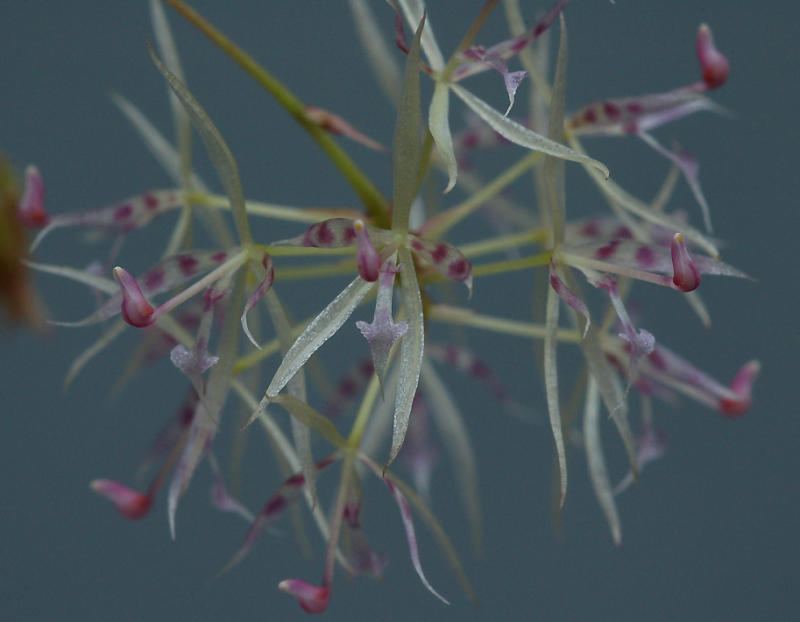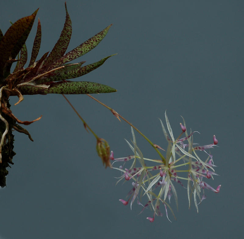 Found in eastern Ecuador in wet lower montane forests at elevations around 450 to 1000 meters as a mini-miniature sized, hot to warm growing epiphyte with an ovoid pseudobulb enveloped by distichous, leaf-bearing sheaths and carrying conduplicate, obliquely ovate, acute leaves covered with red-green pustules, that blooms at most any time of the year on an erect, to 2.4" [6 cm] long, capitate, few to several flowered inflorescence.