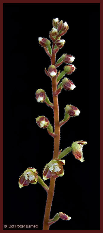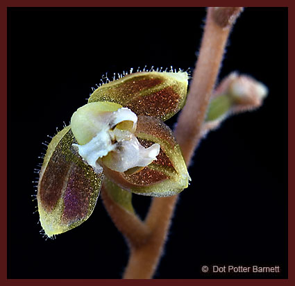 Found from Borneo, Java, Malaysia, Sumatra, the Phillipines and the Iriomote Islands of Japan in lowland and lower montane forests at elevations of 100 to 1500 meters as an evergreen, small sized, warm to hot growing terrestrial with a fleshy creeping rhizome carrying to 8, spiralling in a loose whorl, elliptic to ovate, acute, fleshy, hairy appearing as velvet, dark bottle green with 5 longitudinal and many reticulate veins of gold leaves that are purple green underneath and having a clasped at the base, grooved petiole. The plant blooms with small, insignificant, non-resupinate flowers on an erect, terminal, to 8" [to 20 cm] long, inflorescence.