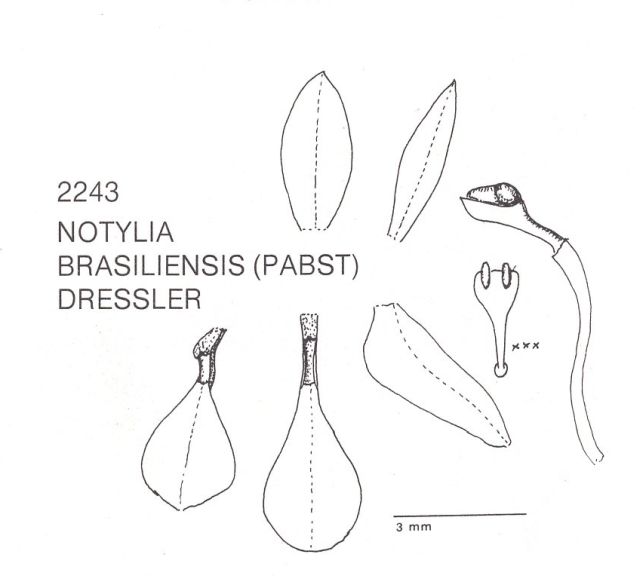 References W3 Tropicos, Kew Monocot list , IPNI ; Orquideologia 9: 214 Dressler 1974 as Notylia brasilense; Orchidaceae Brasilenses Band 2 Pabst & Dungs 1977 as Notylia brasilense drawing fide; *Icon. Pl. Trop. 10: t. 937 Dodson 1984;