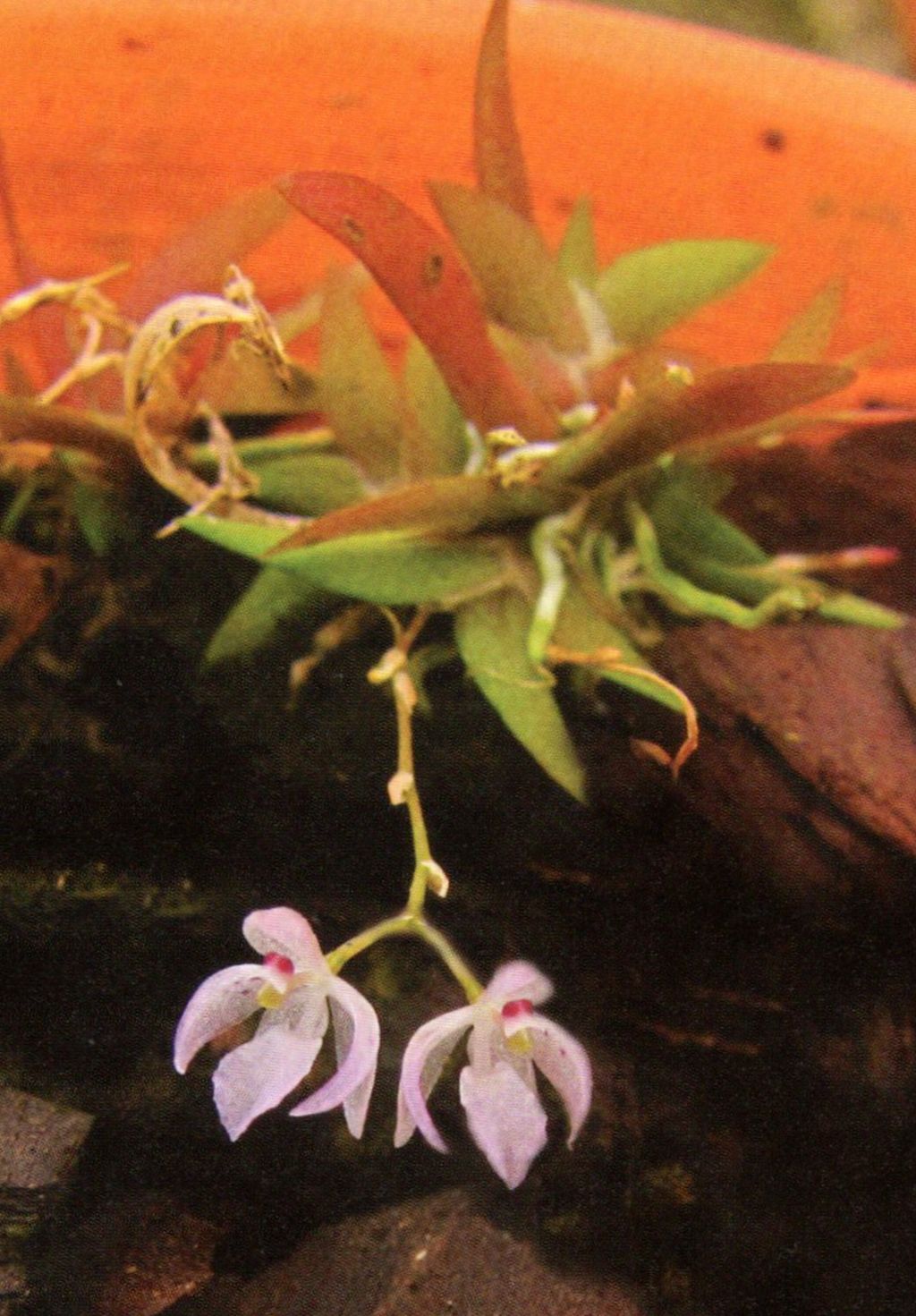 Found in Para state of Brazil in forests at elevations around 160 meters as a mini-miniature sized, cool growing fasciculate epiphyte with green, fleshy, knife-shaped, imbricate, conduplicate with membraneous margins leaves held in a fan that blooms in ther late spring through mid summer on an arched, axuillary, longer than the leaves, .8" [2 mm] long, peduncle thin, green, simultaneously 2 to 3 flowered inflorescence with triangular, yeelow white, acute floral bracts.