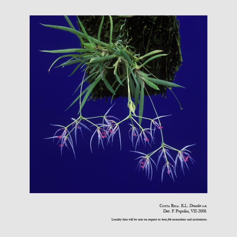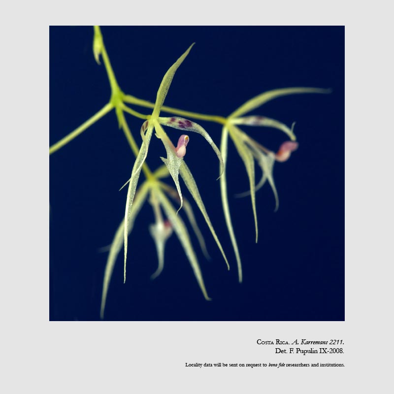 Found in Costa Rica at elevations of 800 to 1600 meters as a mini-miniature sized, pendant, warm to cool growing epiphyte with a fan of leaves around a inconspicuous elliptic-obovate pseudobulb enveloped basally by 3 to 5 leaf bearing sheaths and carrying a single, apical, erect, conduplicate, compressed, lanceolate to narrowly elliptic-lanceolate, acute leaves articulate to the imbricate leafbearing sheaths that blooms in the late spring through summer on a simple, sub-umbellate, racemose to paniculate, each successive sub-umbellate branch carrying 5 to 6 flowers, provided with a long, triangular acute, nearly basal bract, to 1.4" [to 4 cm] long, several flowered inflorescence with triangular, acuminate, shorter than the pedicel floral bracts.