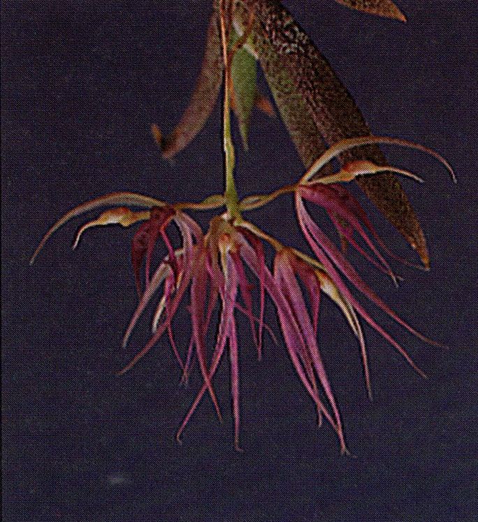 Found in Valle de Cauca and Cauca departments of Colombia at elevations around 1800 to 2200 meters as a mini-miniature sized, cool to cold growing epiphyte with a pseduobulb completely enveloped by conduplicate, leaf-beaaring sheaths carrying equitant, lanceolate to widely elliptic-lanceolate, acuminate, articulate below to the basal leaf sheaths leaves that blooms in the winter on a racemose, provided with obovate-lanceolate, concave acute bracts, subcapitate, .8 to 1.04" [2 to 2.6 cm] long, 5 to 8 flowered inflorescence with lanceolate, shorter than the slender pedicellate ovary floral bracts.