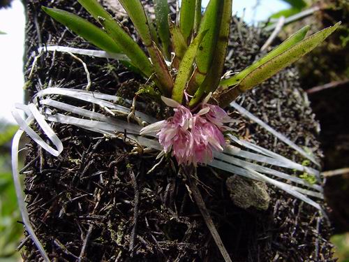 Found in Panama and Colombia in premontane forests at elevations around 100 to 750 meters as a mini-miniature sized, hot growing, equitant epiphyte with flattened pseudobulbs enveloped by distichous, imbricate, longitudinally folded leaf-bearing sheaths carrying elliptic-lanceolate, conduplicate, acute leaves that blooms on a slender, axillary, .4 to .56" [1 to 1.4 cm] long, 4 to 5 flowered inflorescence.