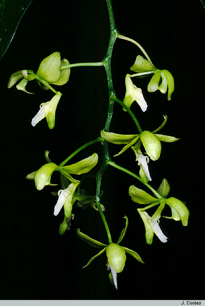 Found only in the Philippines at elevations up to 500 meters as a semi-pendulous, miniature sized, hot growing epiphyte with a short stem carrying a few, 2 ranked, narrowly oblong-lanceolate, leathery, acute and oblique apically leaves that blooms on an axillary, pendulous, 6" [15 cm] long, to 15 flowered inflorescence with floral segments that reflex after opening for a day or so.