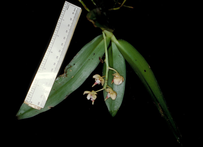 Found on Java and Sumatra at elevations of 1250 to 1900 meters as a miniature to just small sized, cool growing, monopodial epiphyte with thick white roots on a stem carrying 4 to 6, two ranked, oblong to lanceolate, unevenly bilobed apically, thick and fleshy leaves that blooms in the spring on a few to several [6 to 11] flowered, 4.4" to 5.85" [11 to 14.5 cm] long, inflorescence with 3 small sheaths spaced apart and short, obtuse, concave floral bracts carrying sweetly fragrant, simultaneously opening flowers.