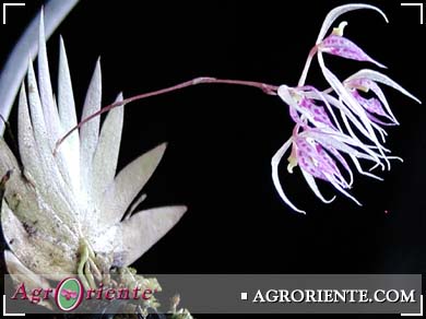 Found in Peru in wet montane forests at elevations around 820 meters as amini-miniature sized, hot growing twig epiphyte with a fan odf distichous, imbricating, conduplicate, linear, acute leaves that completely envelope the stem and blooms spring to early fall on an axillary, paniculate, 1" [2.5 cm] long, few flowered inflorescence.