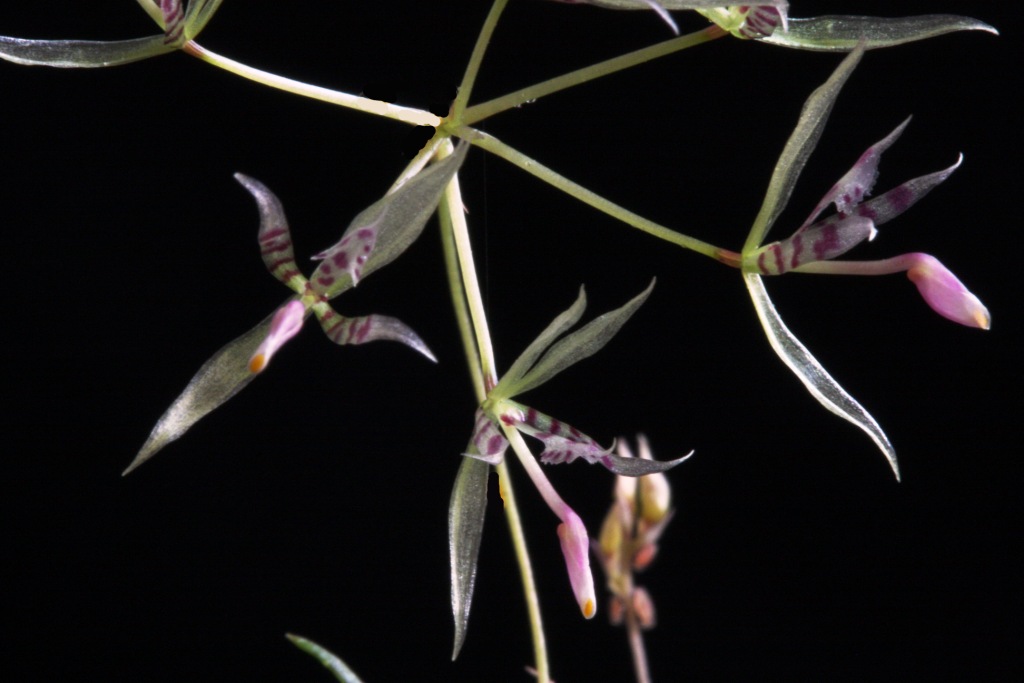 Found in Belize?, French Guiana, Surinam, Guyana, Venezuela, Peru and Brazil as a miniature sized, hot to warm growing, fan orchid with inconspicuous, ellipsoid pseudobulbs carrying several, equitant, fleshy, obliquely oblong-lanceolate or elliptic-lanceolate, acute or subacute leaves that blooms on an axilary, arching, to 2" [to 5 cm] long, slender, few flowered, sub-umbellate inflorescence occuring in the winter and summer.