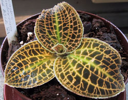 Found as a small sized, hot to warm growing terrestrial in Sumatra, the Lesser Sunda Islands, Papua New Guinea, the Solomon Islands and Vanuatu at elevations of 350 to 800 meters growing in leaf-litter on rocks with almost round to oval leaves with the undersides being purplish and the upper side having velvety dark green with numerous golden veins and a chatoyancy [ie. it changes colors when viewed at different angles] that blooms in the fall and winter on a 10" to 12" [25 to 30 cm] long erect, reddish, many flowered inflorescence with the non-resupinate flowers held towards the apex.