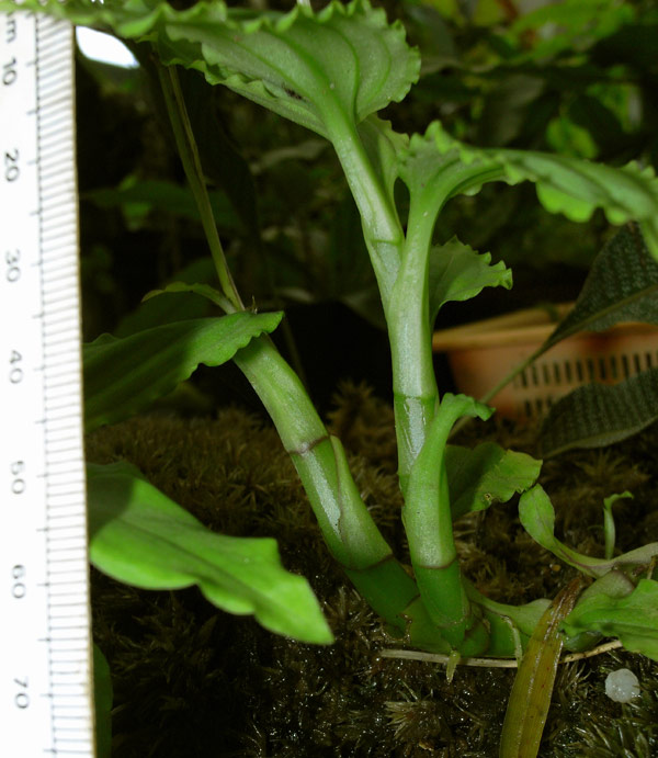 Found in Java, Borneo and the Lesser Sunda Islands in lowland and hill dipterocarp, kerangas and riverine forest at elevations of 800 to 1100 meters as a small sized, warm to cool growing epiphyte with a decumbent becoming upright, green to purple stem carrying 10 to 13, lanceolate, acuminate, bronze to green, 5 prominent veined, petiolate base leaves that blooms in the spring on an erect, terminal, to 16" [to 40 cm] long, many flowered inflorescence.