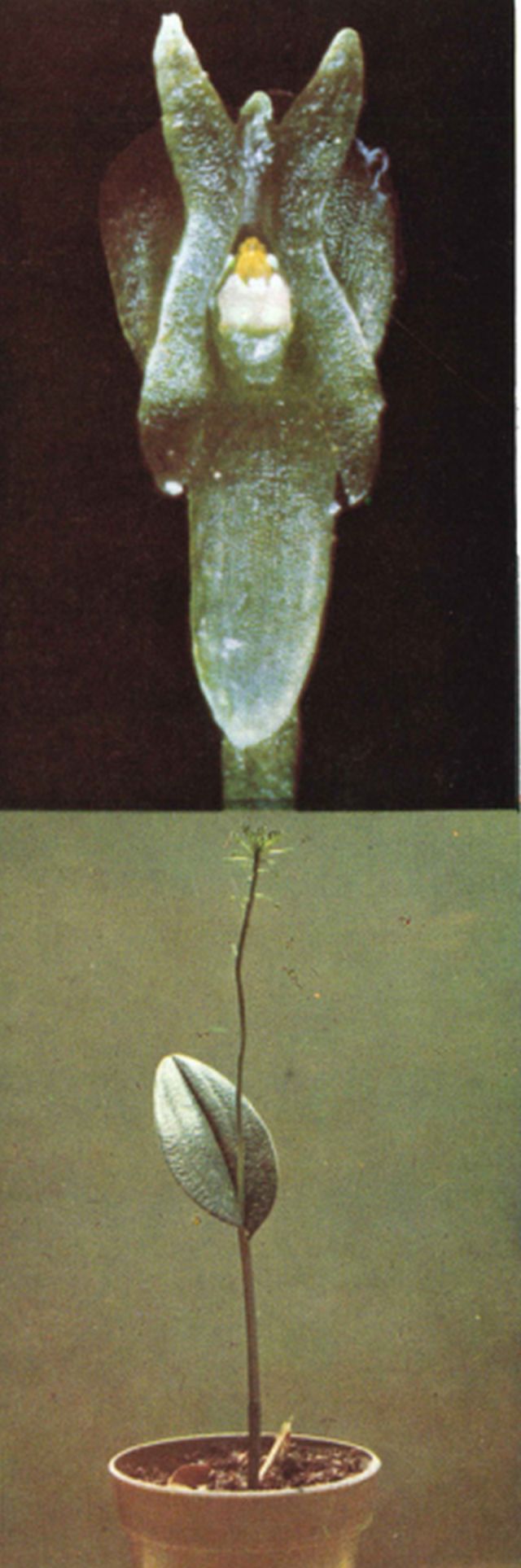 Found in Mexico and Guatemala in open Pine/oak forests on rocks at elevations around 2050 meters as a medium sized, cold grwowing lipotphyte with a small, oblique, shortly ovoid to sub-spherical corm that gives rise to a stem carrying at a heigth of 8 to 13" a single, petiolate, sub-erect, ovate, sub-acute rounded, thick, rigid, coriaceous, somewhat arcuate beneath, transluscent almost white, , finely reticulate above leaf with a tubular, cylindrical, slightly oval petiole that blooms in the late summer and fall on a thin scape, [33 cm] long, terminating in a racemose, densely sub-capitate, 2.4" [6 cm] long, successively few, many flowered inflorescence wth almost horizontal, basally fleshy, widely canaliculate above, acute floral bracts carrying more or less resupinate, very small flowers .