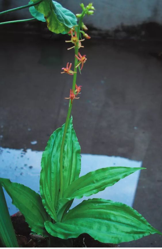 Found in Bangladesh, Assam, Nepal southern and western Yunnan Province of China, the Andaman Islands, Myanmar, Laos and Thailand in forests at elevations of 1300 to 2500 meters as a miniature sized, cool to cold growing terrestrial with a fleshy, several noded, cylindric stem carrying 3, ovate, oblong-ovate to subelliptic, acuminate apically, contracted below into the amplexicaul, sheathlike, petiolate base leaves that blooms in the late spring on a terminal, erect, 9.6 to 12" [22 to 30 cm] long, wingless, 20 to 30 flowered inflorescence with reflexed, narrowly lanceolate, floral bracts