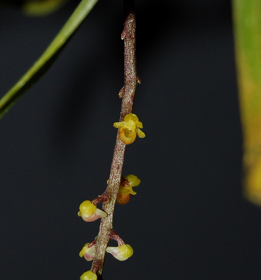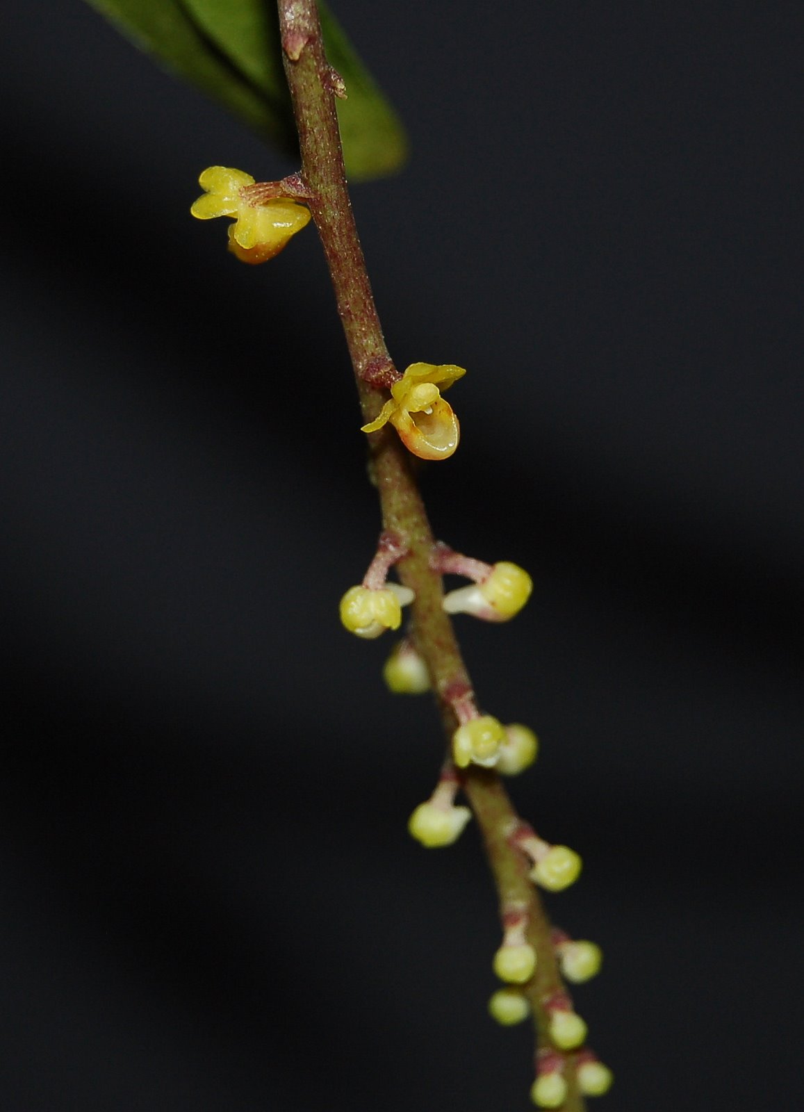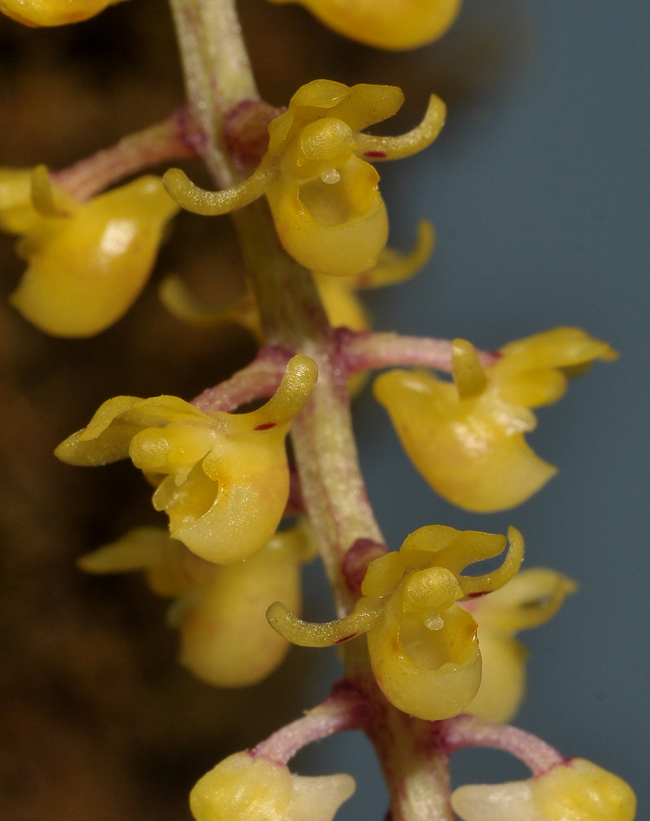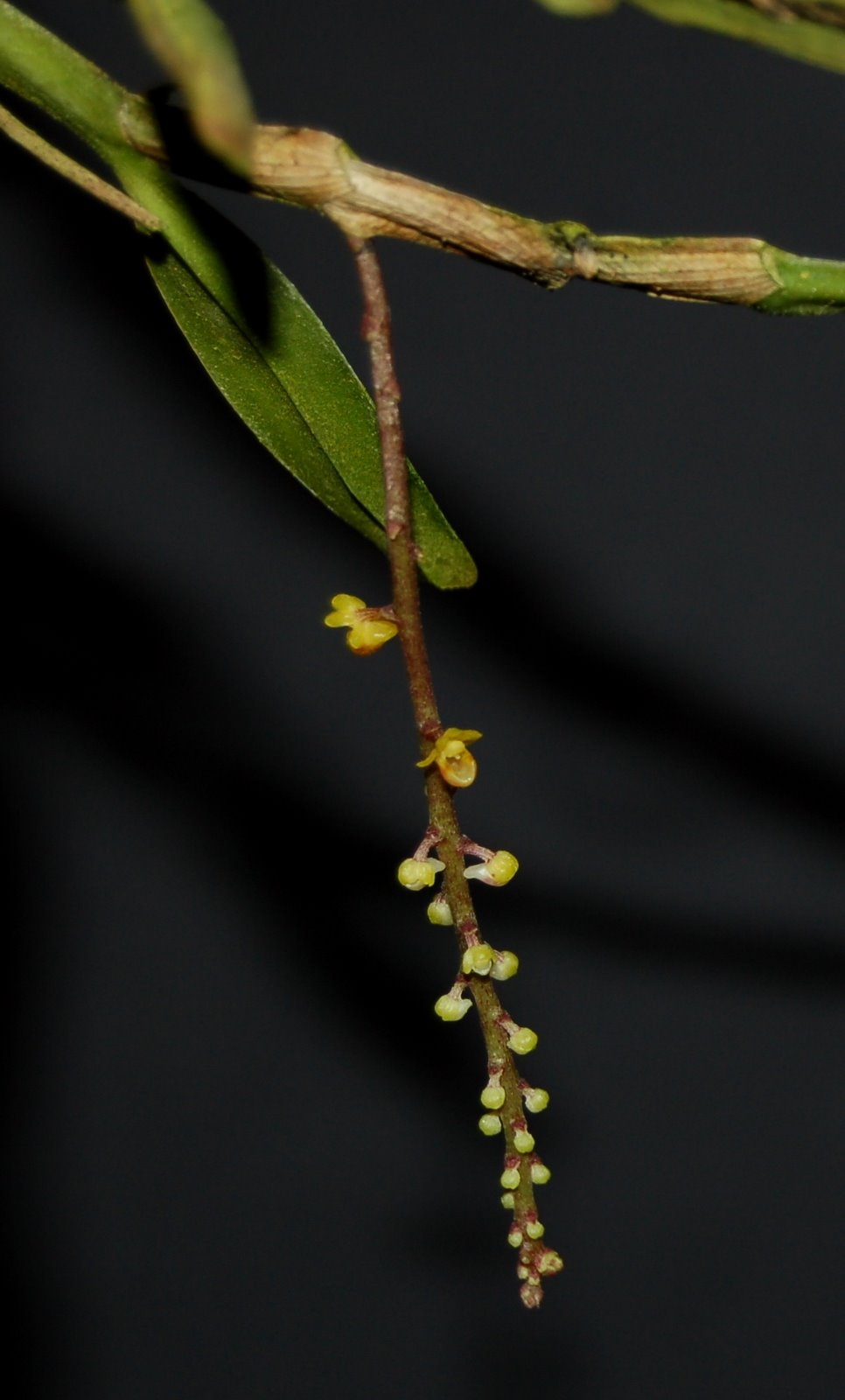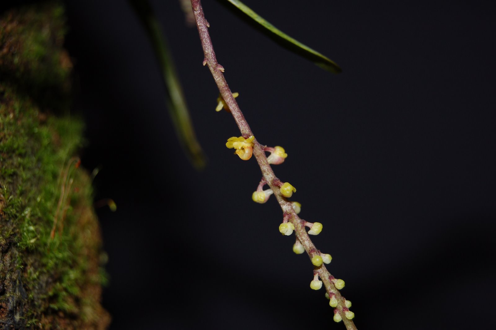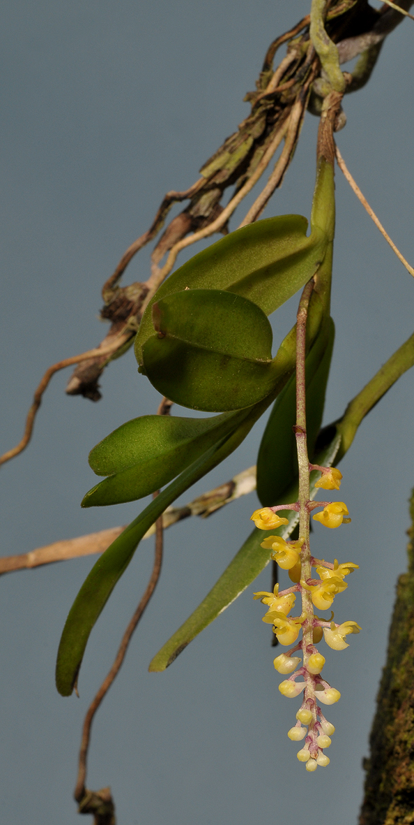 Found in Sulawesi in mossy montane forests on vines and small trees at elevations of 1400 to 1900 meters as a mini-miniature sized, cool, pendent growing epiphyte with a pendent stem with several leaves blooms in the summer on a pendent, sometimes basally single branched, to 6" [to 15 cm] long, 8 to 15 successively to 50 flowered inflorescence