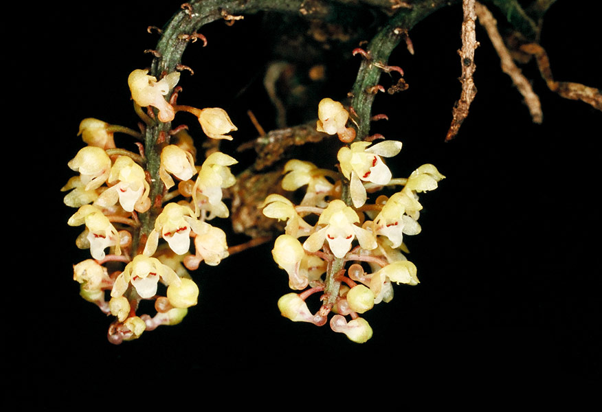 Found in Sulawesi in montane forsts on ridgetops at elevations of 900 to 1500 meters as a mini-miniature sized, warm to cool growing epiphyte with purple suffused leaves that are often purple spotted beneath and blooms in the fall and later winter on a pendent, 1.2 to 3.2" [3 to 8 cm] long, to 20 flowered inflorescence