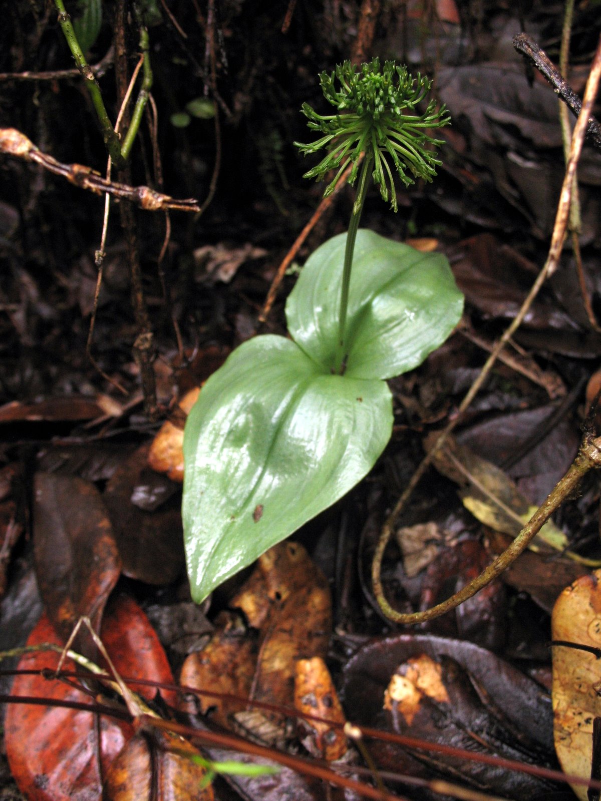 Found in Costa Rica, Colombia, Venezuela and Ecuador in upper montane cloud forests at eleavtions around 1800 to 2600 meters as a miniature to small sized, cool to cold growing terrestrial with pyriform pseudobulbs enveloped by imbricating leafless becoming leaf-bearing sheaths and carrying 2, subopposite, ovate, acute, thin, venation obvious, cuneate below to form an elongate, petiolate base leaves that blooms in the late spring and summer on an erect, termianl, to 10" [to 25 cm] long, many flowered inflorescence with the non-resupinate flowers held in a subumbel.