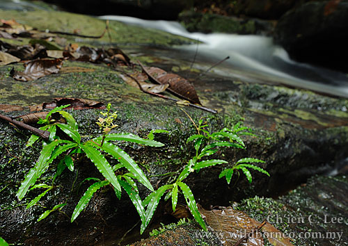 Found in Borneo in open swamp forests or on boulders in river beds at elevations of 300 to 700 meters as a hot to warm growing terrestrial or lithophyte.