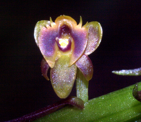 Found in the Philippines at elevations of 60 to 1000 meters as a small to medium sized, hot to warm growing terrestrial or epiphyte with an erect stem carrying 5 to 6, purplish, lanceolate leaves that blooms in the spring through fall on a 10" [25 cm] long, peduncle to 6" [15 cm] long, several flowered inflorescence.