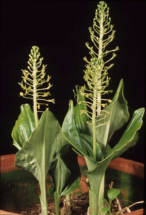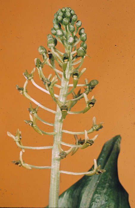 Found in Guerrero Mexico in evergreen cloud forests at elevations of 2000 to 2500 meters as a medium sized, cold growing terrestrial with a conic-ovoid pseudobulb enveloped by 2 to 3 sheaths and carrying 2, apical, opposite, broadly ovate, undulate margins, acute to acuminate, gradually narrowing below into the elongate, petillate base leaves that blooms in the later spring and early summer on a terminal, erect, to 6" [15 cm] long, racemose, many flowered inflorescence carrying non-resupinate flowers