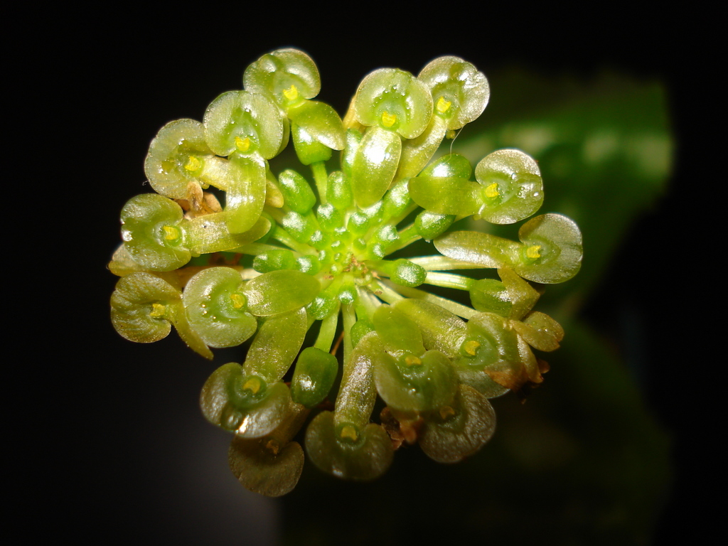 Found in Mexico, Guatemala, El Salvador, Costa Rica, Panama, Colombia and Venezuela on steep slopes in humid forests at elevations of 1100 to 2400 meters as a miniature to medium sized, cool to cold growing terrestrial with a bulbous stem carrying 2, elliptic, acute, shiny bright green above, duller and greyer beneath, petiolate basally and clasping leaves that blooms in the early fall on an erect, terminal, to 5.2" [13 cm] long, sub-umbellate, many flowered inflorescence