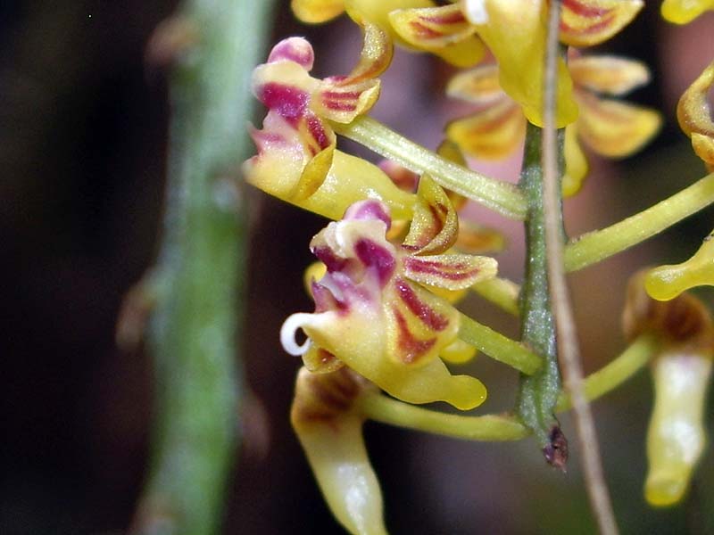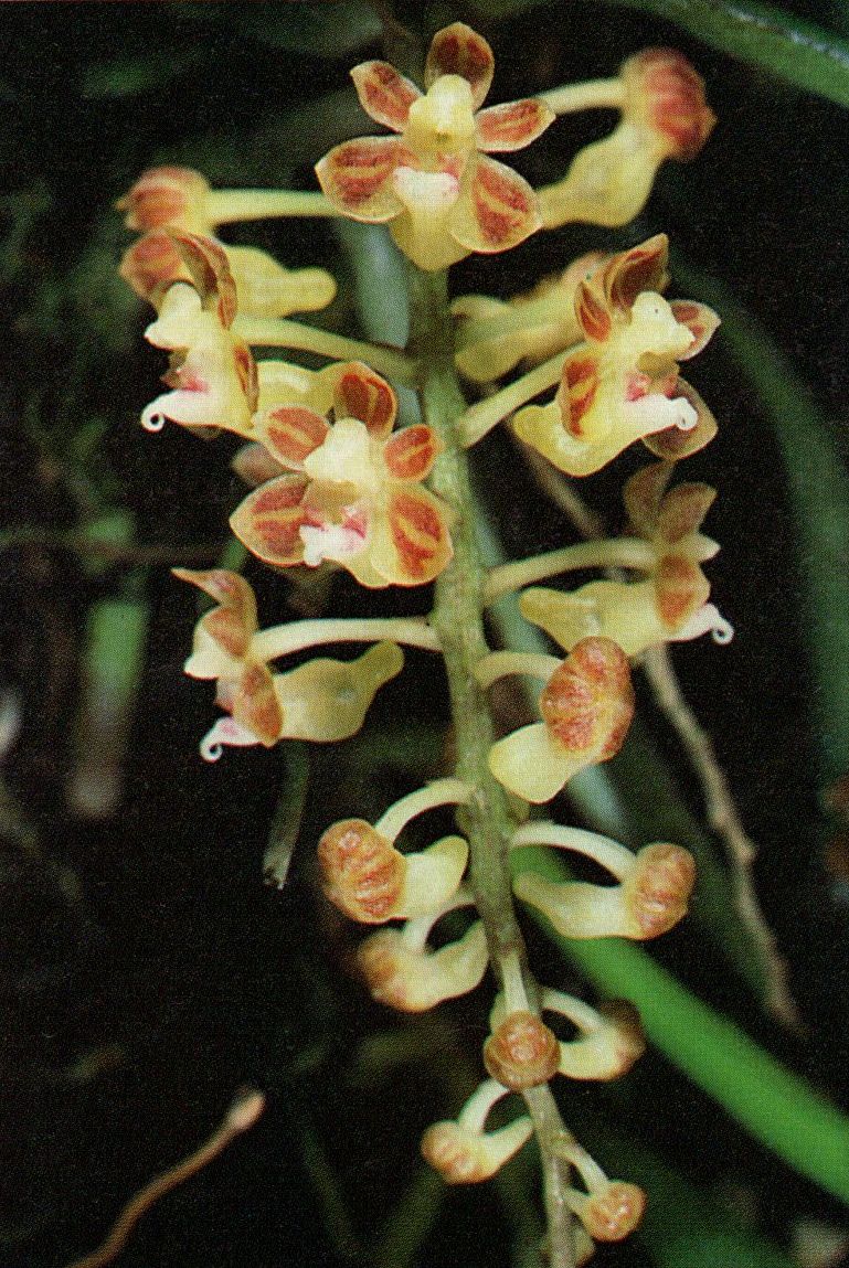 Found in Hainan province of China. Java, the lesser Sunda Islands and Maluku at elevations of 750 to 1300 meters in primary and secondary forests as a medium to large sized, horizontal to pendulous, warm to cool growing epiphyte with elongate, horizontal to pendant stems carrying 15+, linear-lanceolate, unequal apically leaves that blooms in the late spring on several, 2" + [5 cm+] long, several [15 to 20] to many flowered infloresecence arising from near the apex of the stem with about half of the flowers open at any one time.