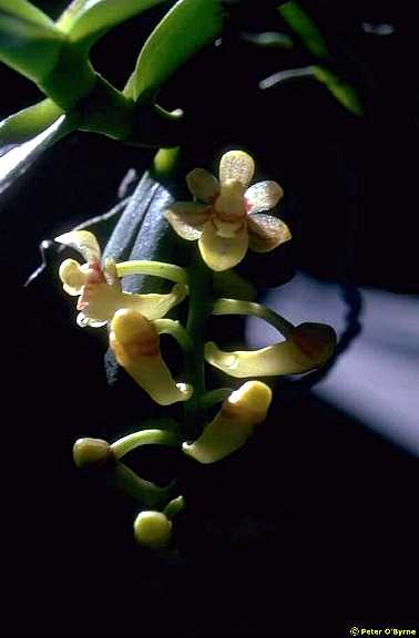 Found in Papua and New Guinea as a small sized, hot growing, monopodial epiphyte at elevations of 100 to 300 meters in deep shade on a small branch of small trees in open seasonal rainforests with a densely leafed stem carrying, linear, obliquely obtuse apically leaves that blooms in the late winter and early spring on a lateral, decurved to descending, 1.6" to 2" [4 to 5 cm] long, several [12] flowered inflorescence with 3 sheathing bracts from which arise wide open, sweetly fragrant, longlasting flowers.