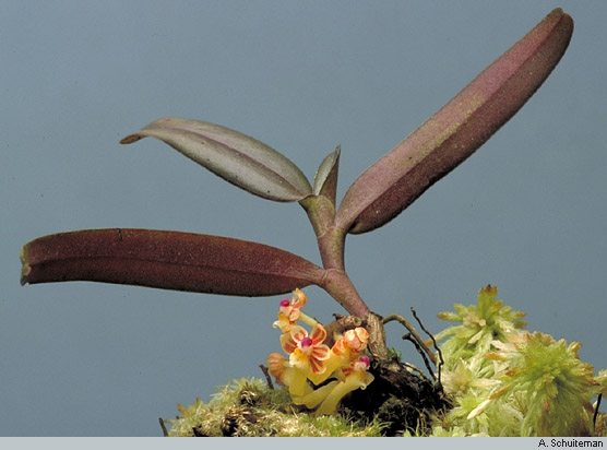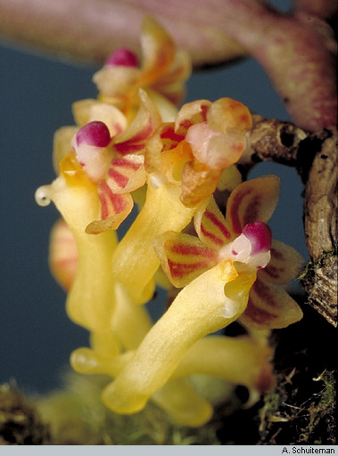 Found in Papua New Guinea in lowland forests at elevations of 400 to 600 meters as a small sized, hot to warm growing epiphyte with a pendant, incurved apically stem carrying 7, curved, half twisted basally, lanceolate, unequally and obtusely bilobed apically leaves that blooms in the spring and fall on a decurved, short, densely 5 to 14 flowered, elliptic in cross-section peduncle and an angular, adpressed, black brown furfuraceous-puberulous rachis, racemose inflorescence with 2 shortly tubular, obtuse, keeled, small scales and triangular, adpressed, concave, acute floral bracts and carrying widely opening, fleshy flowers.