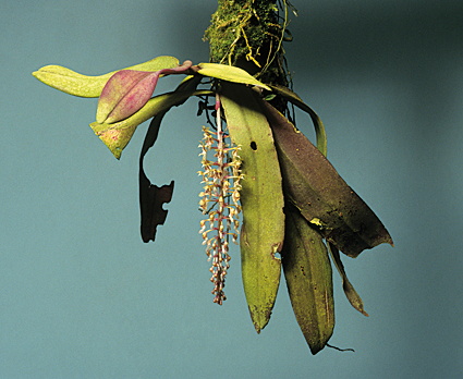 Found in Sabah and Sarawak Borneo in ridge forests and primary montane forests at elevations of 800 to 1300 meters as a small sized, warm to cool growing, pendent epiphyte with a slightly compressed stem carrying 3 to 4, the largest, oblong, stiff, leathery, green with maroon spots and maroon suffused margins, underside suffused wqith purtple, apex obtuse, , unequally bilobed leaves that blooms in the late spring and summer on a lateral, from the basal part of the astem, descending, peduncle '6 to .8" [1,5 to 2 cm] long, pale greenish pink with darker pink spots, 2.6" [6.5 cm] long overall, rachis indistinctly ribbed, mostly simultaneously 40 flowered inflorescence