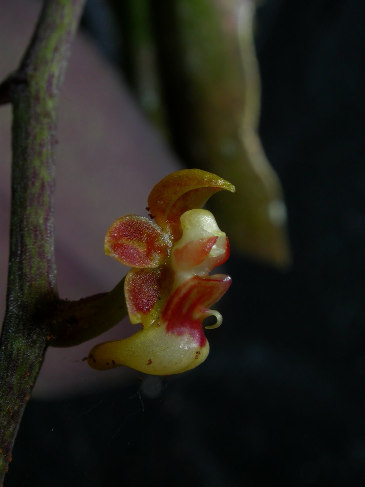 Found in Java at elevations of 250 to 1800 meters as a miniature sized, monopodial, hot to cool growing epiphytic orchid with semi-pendulous stems with the apex turned upwards carrying 4 to 6, stiff, violet suffused, undulate margins, very unequal apically leaves that blooms in the fall on slowly lengthening to 6" [15 cm] long, several flowered inflorescence with 3 to 4 flower open at any one time.