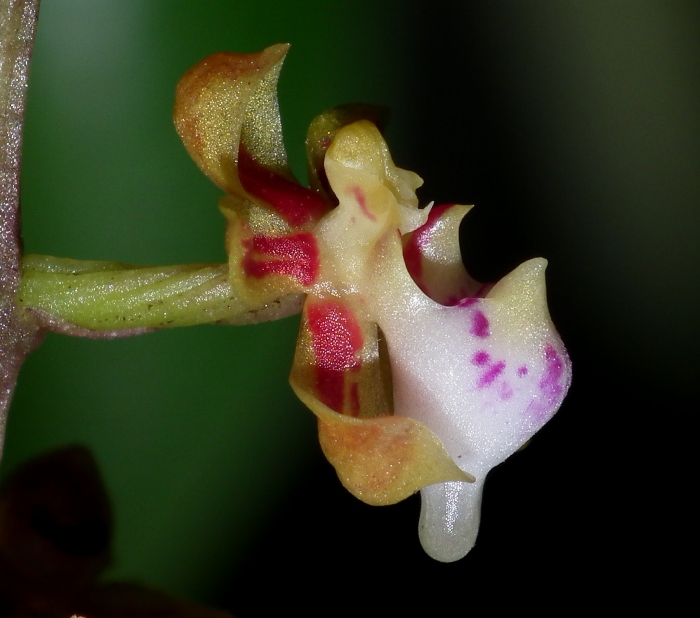 Found in the Philippines at elevations around 300 meters as a medium sized, hot growing epiphyte with a cylindrical, semi-pendulous, zig-zag stem carrying leathery, oblong to elliptic, alternate, unequally bilobed apically leaves that blooms in the late summer and early fall on a pendent, rachis to 1.3" [3.1 cm] long, 4" [10 cm] long overall, many flowered inflorescence carrying non-resupinate flowers.
