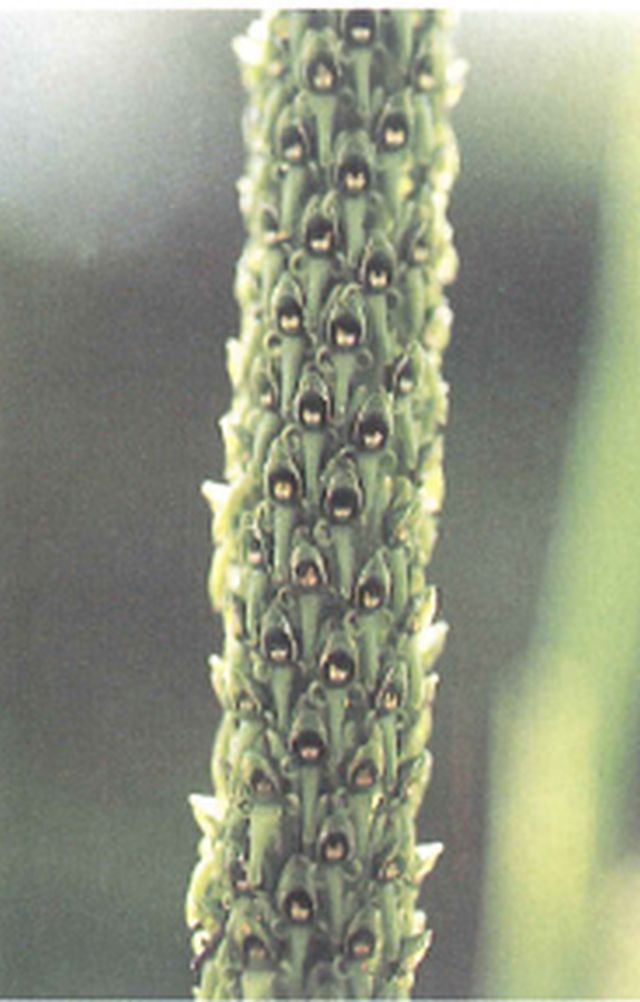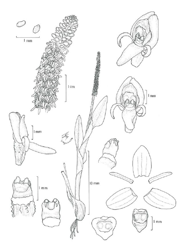 Found in Mexico in oak and oak/pine and fir forests at elevations of 2200 to 3000 meters as a small to medium sized, cold growing terrestrial with subterranean, globose, white pseudobulbs giving rise to an erect stem enveloped completely by leaf sheath bases and carrying 2, with a tubular vein, narrowly elliptic to lanceolate to oblong, acute to obtuse apically leaf that blooms in the summer on an erect, peduncle to 3" [7.5 cm] long, rachis 3" [7.5 cm] long, bottle brush-like, densely many flowered inflorescence carrying non-resupinate, green flowers.