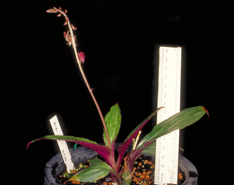 Found in southern Yunnan province of China, Thailand and Sumatra on shaded slopes at elevations of 600 to 1500 meters as a miniature sized, hot to warm growing terrestrial with a creeping rhizome giving rise to an elongating, cylindric, fleshy stem carrying up to 10, obliquely ovate to elliptic, acute, cuneate below into the petiolate base leaves that blooms in the late spring on an erect, terminal, 4.2 to 7.2" [10.5 to 18 cm] long, longitudianlly ridged, laxly 7 to 8 flowered inflorescence with reflexed, lanceolate, floral bracts.