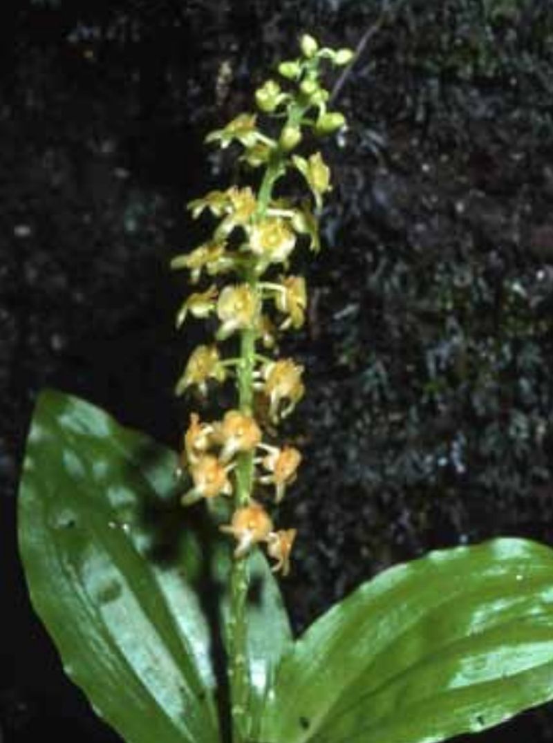 Found in the Bismark Islands, the Solomon Islands, Samoa, Vanuatu and the Cook Islands in foothills to montane forests at elevations of 400 to 500 meters as a small sized, hot growing terrestrial with a creeping rhizome giving rise to an elongate, erect, leafy all along the stem carrying up to 12, distichous, twisted basaly to lie in one plane, ovate, acute, petiolate base leaves that blooms on an erect, 12" [30 cm] long, densely many flowered inflorescence with reflexed, linear, acuminate floral bracts.
