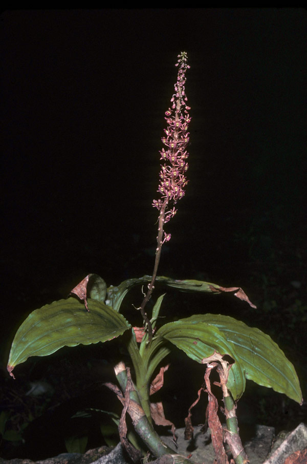 Found in Java in shady places in humus on the forest floor or in rock crevasses at elevations of 600 to 1500 meters as a small to just medium sized, warm to cool growing terrestrial with a parallel to the ground and rooting for a short distance then turning upwardstem carrying 7 to 11, broadly lanceoalte, long acuminate, 5 veined with 2 smaller ones near the margins, obliquely joining the petiolate base leaves that blooms in the spring on an erect, terminal, to 13.6" [34 cm] long, ribbed, many flowered inflorescence