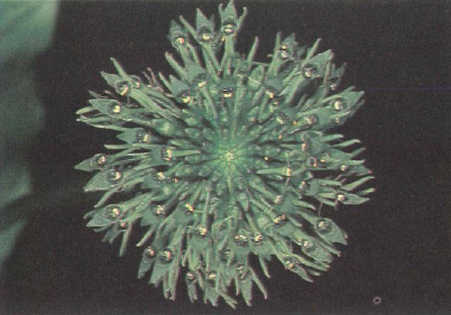Found in central and soutwestern Mexico in mesophyllous forest among rocks in rich humus as a miniature to medium sized, cool growing terrestrial with a above ground, nearly round, ovoid, pyriform to conic-pyramidal, oblique, green corm giving rise to 2, petiolate, arising from the base of the corm, sub-opposite, arcuate spreading, ovate to sub-orbicular, acute to abruptly acuminate, rounded to shortly cuneate base, undulate margins, several veined, conspicuously keeled beneath, membraneous, shining green leaves that blooms in the mid summer on an erect, slender, several keeled, high, sharp, slightly twisted, green, 8" [20 cm] long overall, rachis to 1.4" [3.5 cm] long, sub-umbellate, crowded, many flowered inflorescence with very small, fleshy, triangular, mucronate, green floral bracts and carrying green, long lasting flowers.