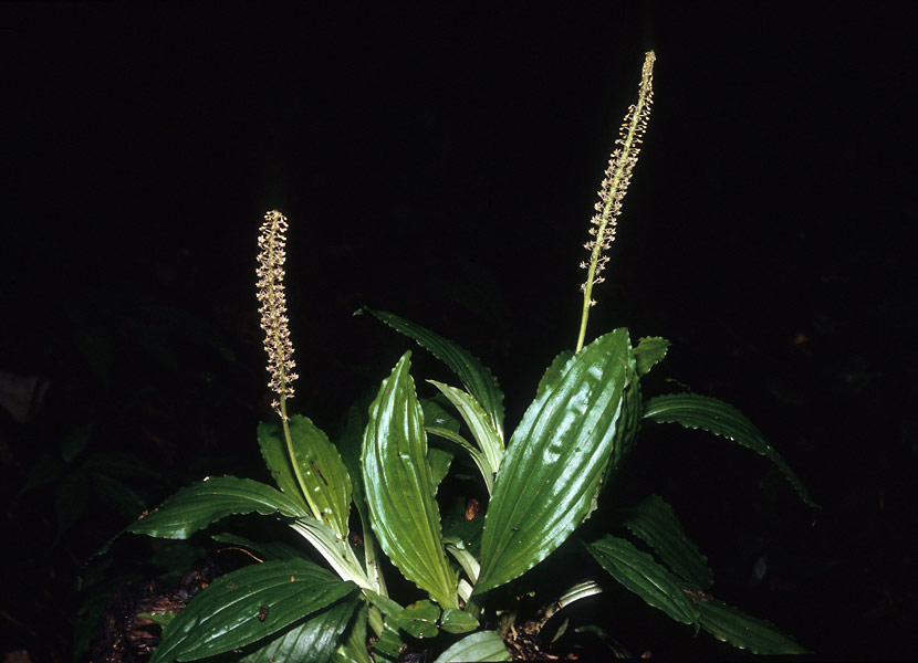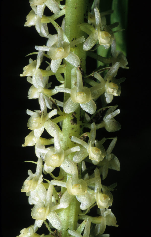 Found in Sumatra and Java in montane forests at elevations of 800 to 1100 meters as a miniature to small sized, warm to cool growing terrestrial with a short, creeping, fleshy rhizome giving rise to an erect, short pseudobulb carrying 5 to 7 close set, obliquely lanceolate, acuminate, acute, somewhat undulate margin, pale green, narrowing into the petiolate base leaves that blooms in the spring on an erect, terminal, peduncle angular, .8 to 1.4" [2 to 4 cm] long, 3.4 to 7.6" [8.5 to 19 cm] long, cylindrical, densely many flowered inflorescence with linear-lanceolate floral bracts.