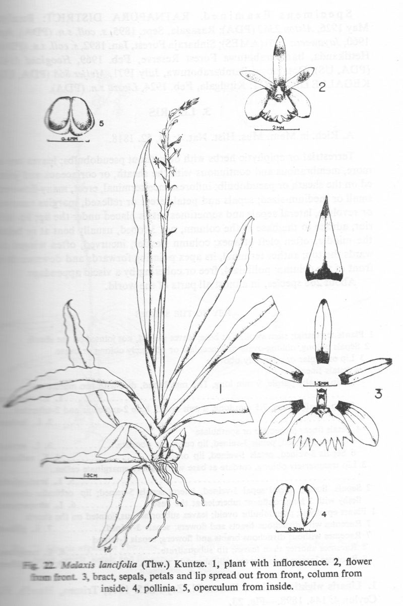 References W3 Tropicos, Kew Monocot list , IPNI ; A Revised Handbook to the Flora of Ceylon Dassanayake & Fosberg 1981 as Malaxis lancifolia drawing fide;