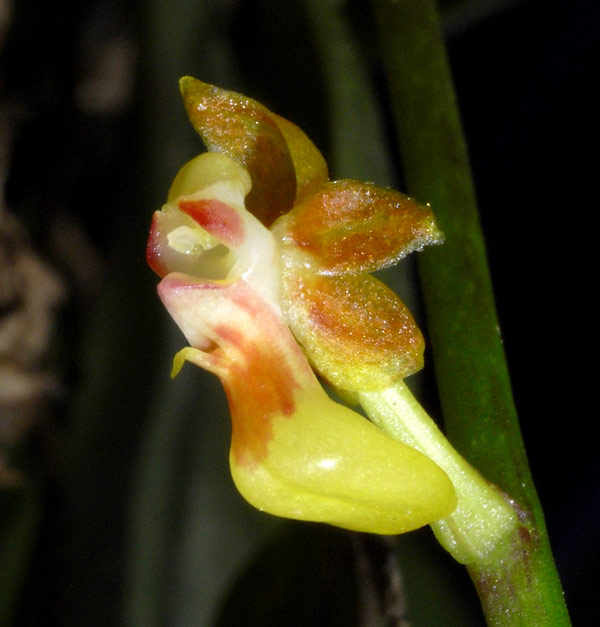 Found in Penninsular Malaysia, Borneo, Java and Sumatra in lower montane and hill forests at elevations of 750 to 1500 meters as a small to medium sized, warm to cool growing epiphyte with pendulous, apically turning erect, stems carrying many, elliptic, rigid, green above, violet below, margins undulate, unequally and obtusely bilobed apically leaves that blooms in the fall on a pendant, to 10" [25 cm] long, many flowered inflorescence