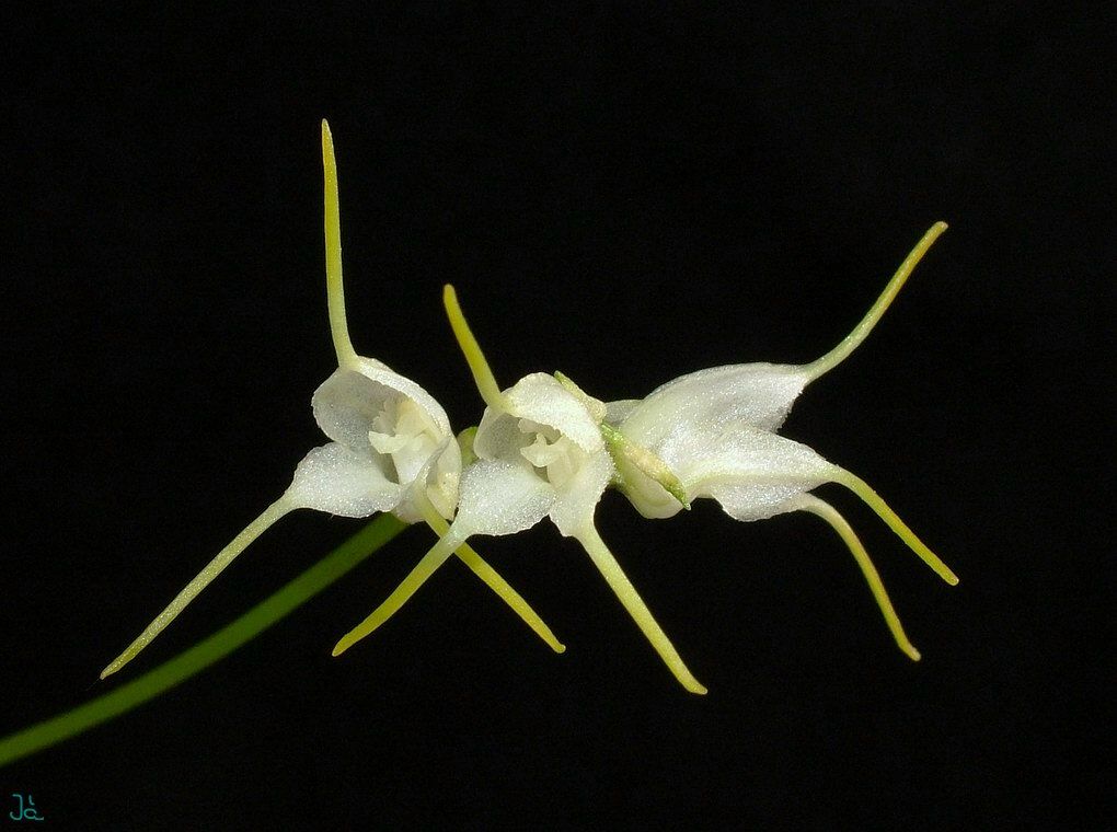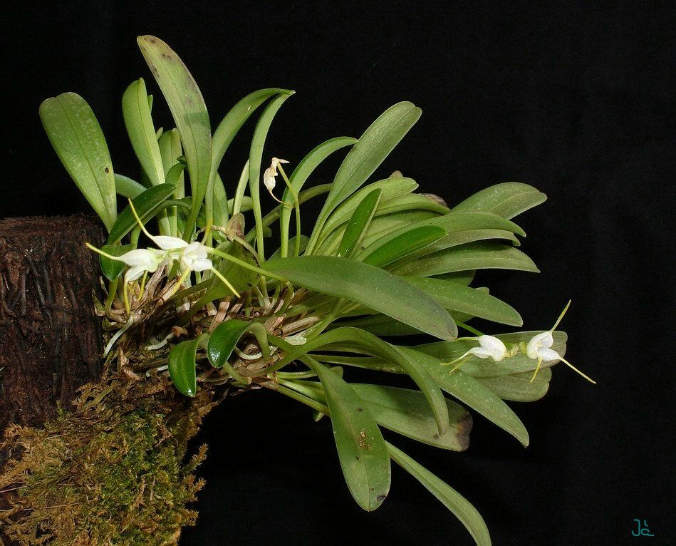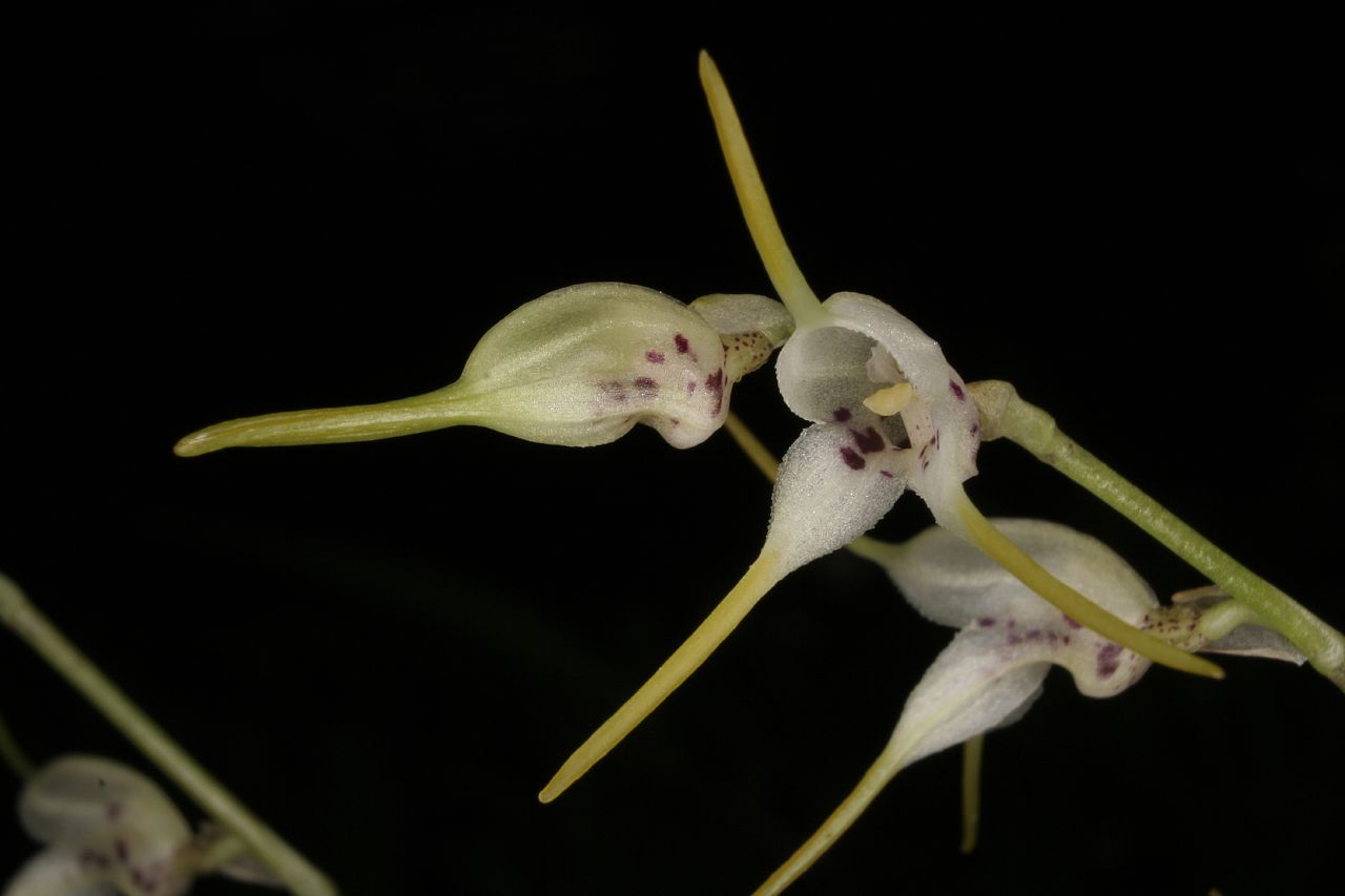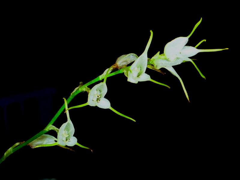 Found in Ecuador and Peru in subtropical, evergreen cloud forests of the western slopes of the Andes at elevations of 1500 to 2800 meters as a mini-miniature sized, cool to cold growing epiphyte with short, terete ramicauls enveloped basally by 2 to 3 tubular sheaths and carrying a single apical, oblong-oblanceolate, retuse, coriaceous, carinate leaf with a long, channeled petiole that blooms in the late winter and early spring on an erect, slender, 12" [30 cm] long, terete, successively few to several [7] flowered inflorescence with a tubular bract near the base and conspicous, ovate, concave floral bract that is longer than the ovary.