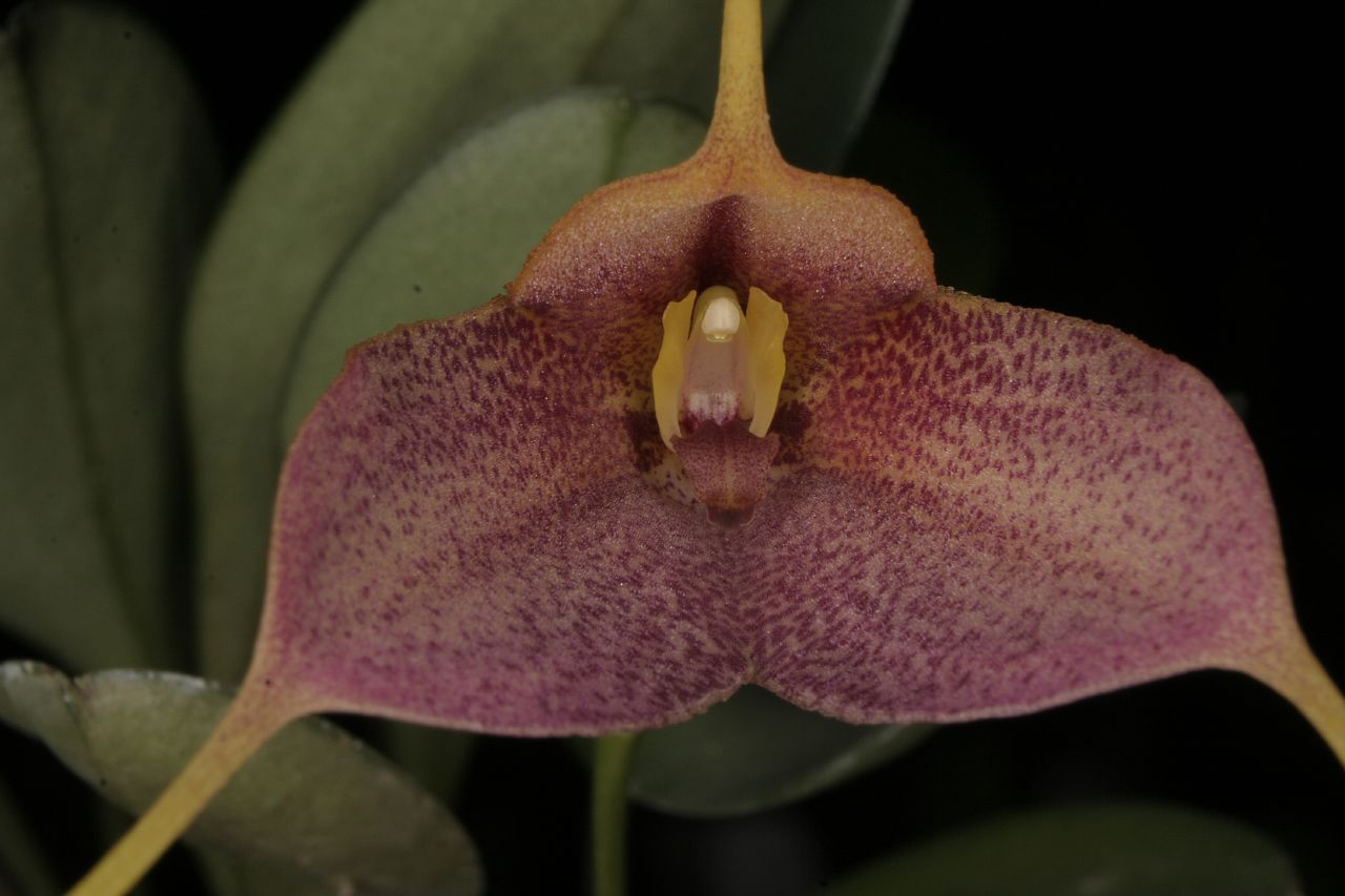 Found in southeastern Ecuador at elevations around 1700 meters as a mini-miniature sized, cool growing epiphyte with slender, erect ramicauls enveloped basally by 2 loose, tubular sheaths and carrying a single, apical, erect, coriaceous, narrowly elliptical, subacute to obtuse, gradually narrowing below into the petiolate base leaf that blooms in the summer on a horizontal, 1.4" [3.5 cm] long, single flowered inflorescence arising from low on the ramicaul with a basal bract and a tubular floral bract