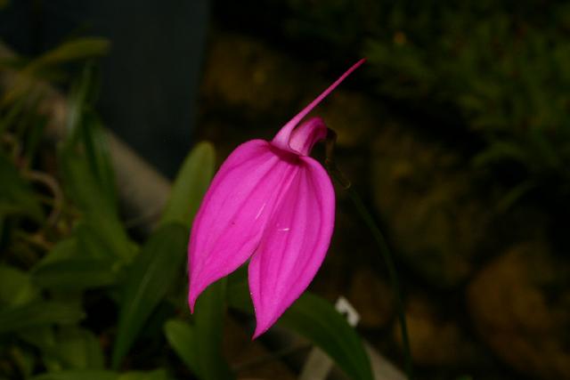 Found in northern Peru at altitudes of 2000 to 3300 meters as a mini-miniature sized, cold growing terrestrial or lithophytic, cold to warm growing orchid from cool montane forests and on rocky slopes in intense sunlight with a very short, inconspicuous ramicaul encased by 2 to 3 short, tubular membraneous sheaths with erect, coriaceous, oblanceolate, acute, leaves with a deep furrow down the center into the channeled petiole that blooms on an apical, erect, reclining or horizontal, slender, terete, to 12" [30 cm] long, inflorescence with two distant tubular bracts occuring in the summer through winter with solitary flowers held way above the leaves. The most distinguishing factor of this species is the elongate inflorescence with crimson-red to purple, white or orange flowers. Shy bloomers are encouraged to bloom by increasing the light levels to where the leaves just slightly start to yellow.