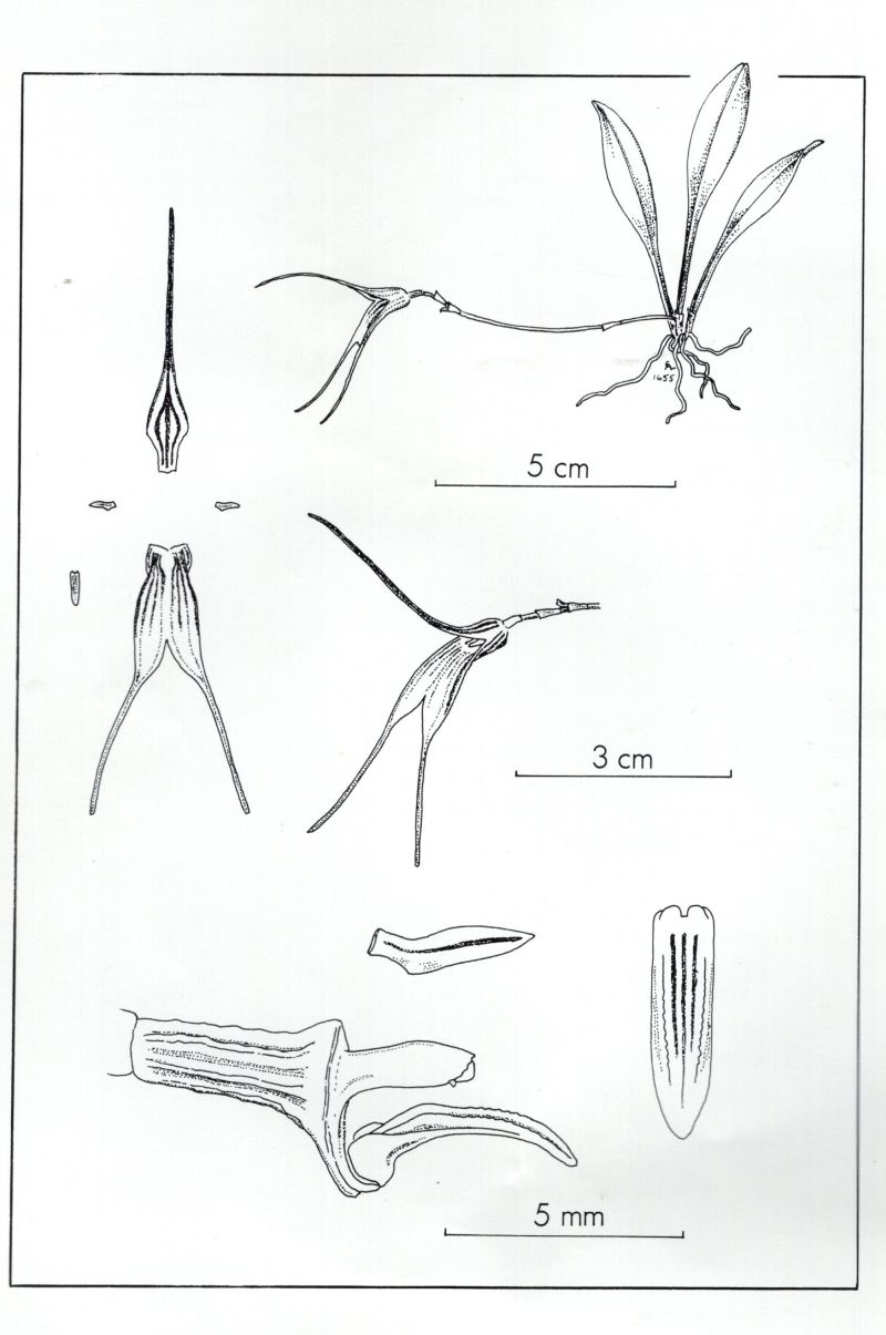 Found in Ecuador and Peru at altitudes of 1500 to 2450 meters as a mini-miniature sized, cool to cold growing epiphyte with slender, suberect ramicauls enveloped basally by 2 to 3 loose, tubular sheaths carrying a single, apical, coriaceous, elliptical, acute leaf that is cuneate below into the slender petiole and blooms in the fall on a horizontal, slender, 2" [5 cm] long, successively few flowered, racemose inflorescence arising from low on the ramicaul with a bract below the middle and a tubular floral bract.