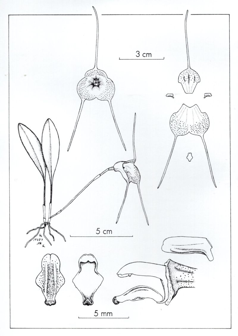 References W3 Tropicos, Kew Monocot list , IPNI ; *Icones Pleurothallidinarum XVIII. Systematics of Pleurothallis subgen. Pleurothallis sect. Pleurothallis, subsect. Longiracemosae, subsect. Macrophyllae-Racemosae, subsect. Perplexae, subgen. Pseudostelis, subgen. Acuminatia. Addenda to Dracula, Lepanthes, Masdevallia and Pleurothallis. Miscellaneous new species of Dryadella, Lepanthes and Pleurothallis Luer 1999 drawing fide; Masdevallia's in Kleur Vol 1 P M Oversteegen, Eisses & A P Sijm 2001 photo fide; Icones Pleurothallidinarum XXIII Systematics of Masdevallia Part 4 Luer 2002 drawing fide; A Treasure of Masdevallia Vol 28 Luer & Dalstroem 2006 watercolor fide; Orchidaceae Masdevallia and Affiliates Dodson & Luer 2009 drawing fide; Harvard Papers in Botany, Vol. 17, No. 2, pp. 333 to 368 2012 MISCELLANEOUS NEW SPECIES IN THE PLEUROTHALLIDINAE (ORCHIDACEAE) Carlyle A. Luer; Orchids Masdevallia with its segregates including Dracula Zelenko 2014 photo fide;